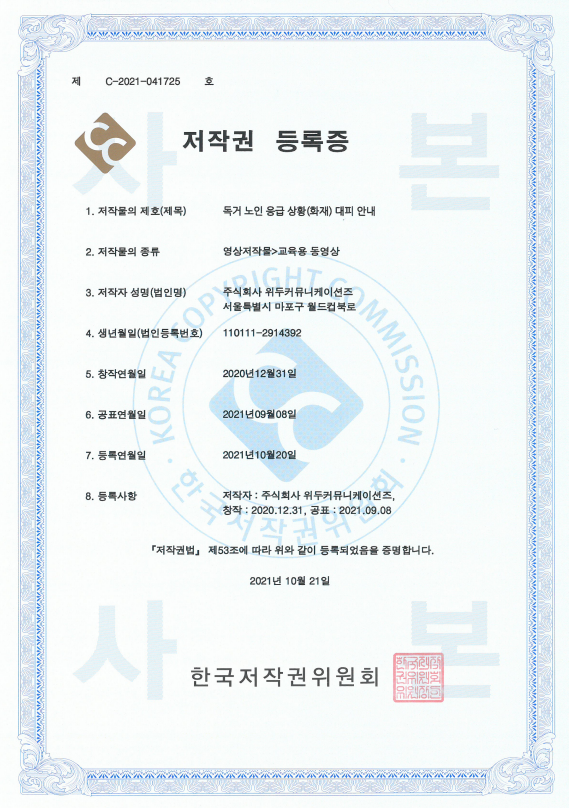 [한국/저작권] 독거 노인 응급 상황(화재) 대피 안내 페이지 정보 작성자 WeDu 댓글 0건 조회 5,159회 작성일 21-12-31 12:41 본문 2021-10-21 저작권 C-2021-041725 영상저작물>교육용 동영상 List Previous[한국/저작권] 장보기 인지훈련 게임 21.12.31 Next[한국/저작권] OLL KIDS/MATH 21.12.31